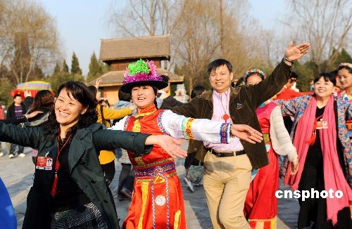 3月8日下午,出席全國政協(xié)十一屆二次會議的部分政協(xié)委員利用休會時間,來到北京中華民族博物院(中華民族園),與民族演員一起感受民族文化。 中新社發(fā) 遠舟 攝