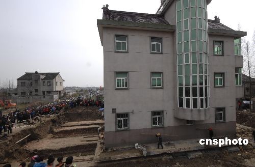 3月8日,浙江省嘉興市秀洲區(qū)王店鎮(zhèn)假山村村民徐小觀家1700多噸重的三層別墅開(kāi)始整體平移,吸引眾多村民前來(lái)觀看。由于嘉紹高速(嘉興至紹興)的建設(shè)需要,這棟樓房需由北向南平移15米,通過(guò)樓房整體平移取得了“三方共贏”的效果——不僅為修路讓出了道,為順利動(dòng)遷節(jié)省了成本,而且也為自己節(jié)省了至少20萬(wàn)元的重建費(fèi)用。同時(shí)在“移動(dòng)”的樓里正常生活絲毫不受影響。中新社發(fā) 儲(chǔ)永志 攝