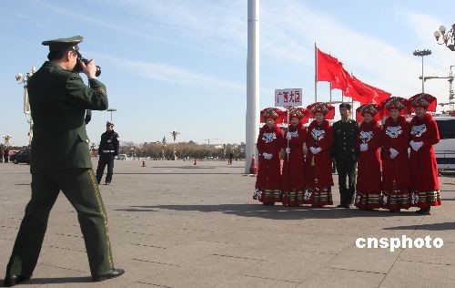 3月9日,十一屆全國人大二次會(huì)議第二次全體會(huì)議在人民大會(huì)堂舉行。解放軍為禮儀小姐拍照留念。中新社發(fā) 張婭子 攝
