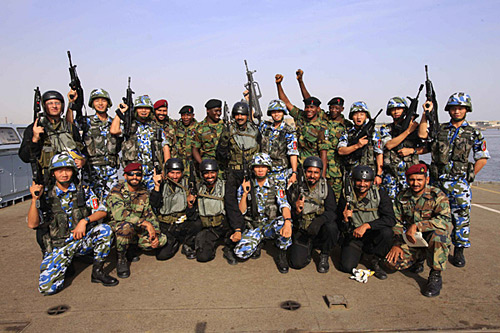 中國海軍特戰(zhàn)隊員、巴基斯坦海軍特戰(zhàn)隊員和尼日利亞海軍特戰(zhàn)隊員在海上直升機滑降演習(xí)現(xiàn)場合影。查春明 攝