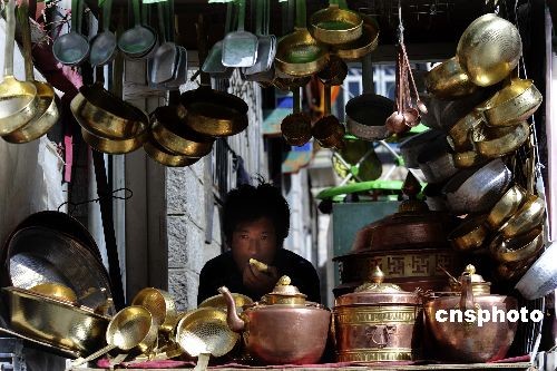 3月9日,西藏拉薩八角街,一家藏族手工藝銅器攤商品琳瑯滿目。中新社發(fā) 廖攀 攝