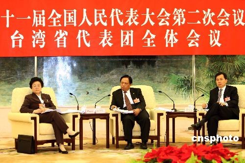 3月9日,全國人大臺(tái)灣省代表團(tuán)在人民大會(huì)堂舉行全體會(huì)議,審議全國人大常委會(huì)委員長吳邦國全國人大常委會(huì)工作報(bào)告。圖為全國臺(tái)聯(lián)會(huì)長梁國揚(yáng)代表(中),全國臺(tái)聯(lián)理事魏麗惠(左)和臺(tái)盟中央副主席陳蔚文出席會(huì)議。中新社發(fā) 杜洋 攝