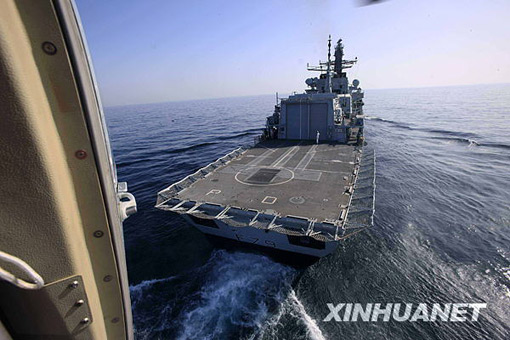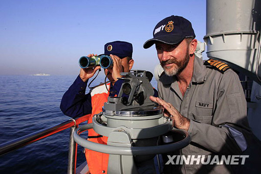 3月9日,在巴基斯坦南部卡拉奇港附近的阿拉伯海舉行的“和平-09”海上多國聯(lián)合軍事演習(xí)實(shí)兵演練中,澳大利亞海軍觀察員(右)在中國海軍“廣州”號(hào)驅(qū)逐艦上觀摩演習(xí)。查春明 攝
