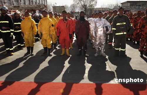 3月10日,西藏公安消防特種裝備車輛服役儀式在拉薩舉行,儀式上消防官兵列隊(duì)整齊。中新社發(fā) 廖攀 攝