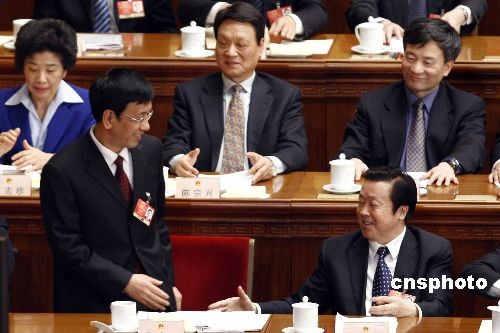 3月10日,十一屆全國(guó)人大二次會(huì)議在北京人民大會(huì)堂舉行第三次全體會(huì)議,最高人民法院院長(zhǎng)王勝俊、最高人民檢察院檢察長(zhǎng)曹建明分別作工作報(bào)告。圖為曹建明作完報(bào)告回到座位后與王勝俊握手。中新社發(fā) 盛佳鵬 攝