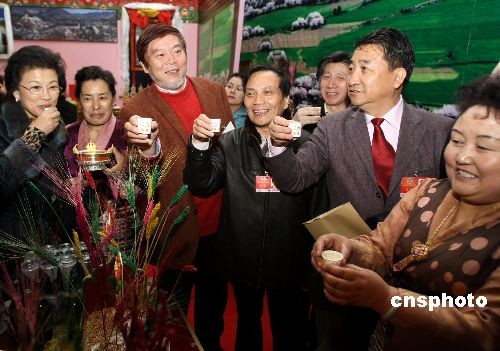 3月11日,參加全國(guó)政協(xié)會(huì)議的文藝界委員參觀在北京民族宮舉辦的西藏民主改革50年大型展覽。圖為委員們?cè)谖鞑孛窬语L(fēng)格的布景館里共飲酥油茶。中新社發(fā) 傅丹丹 攝