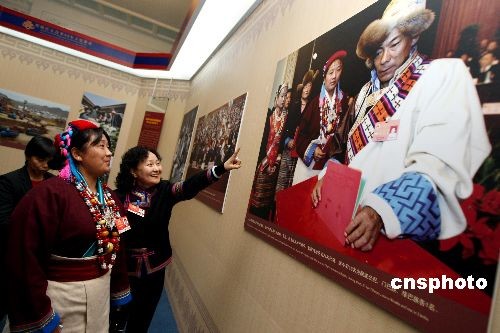 3月11日,全國政協(xié)民族界委員參觀在北京民族宮舉辦的西藏民主改革50年大型展覽,西藏自治區(qū)錯那縣民政局副局長美朵曲珍在展廳里看到了自己的照片。中新社發(fā) 傅丹丹 攝