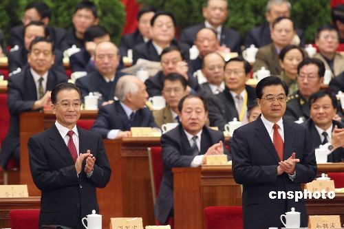3月12日,全國政協(xié)十一屆二次會議舉行閉幕大會。國家主席胡錦濤、國務(wù)院總理溫家寶為通過政治決議鼓掌。中新社發(fā) 盛佳鵬 攝