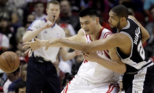 3月15日早上進(jìn)行的一場NBA常規(guī)賽中,昨天擊敗了山貓的火箭沒有能夠取得連勝。面對西南賽區(qū)的第一名圣安東尼奧馬刺,姚明拿到了18分11個籃板球,鄧肯拿到了15分12個籃板;鸺詈箨P(guān)頭連續(xù)錯失反超和扳平拖入加時的機(jī)會,最終以85比88遺憾的輸給了馬刺。