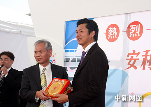 圖為臺(tái)灣海峽兩岸觀光旅游協(xié)會(huì)秘書(shū)長(zhǎng)吳朝彥向安利大中華區(qū)行政總裁顏志榮致贈(zèng)臺(tái)北縣新莊百年老店的傳統(tǒng)喜餅。
