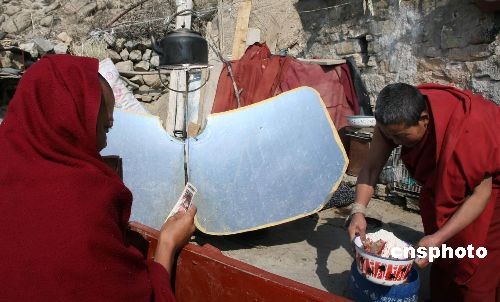 3月18日,拉薩哲蚌寺的僧尼在用太陽灶燒水。西藏首府拉薩市地處海拔3650米的河谷沖擊平原,是世界上海拔最高的城市之一。這里年日照時數(shù)3000小時以上,故有"日光城"之美稱。為節(jié)約能源,拉薩市正在大范圍推廣太陽灶。據(jù)稱,在拉薩市,一臺太陽能灶每年可節(jié)約燒柴12立方米。中新社發(fā) 王林 攝