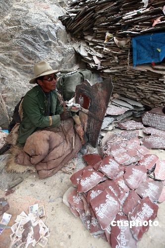 3月18日,拉薩藥王山下的刻經(jīng)人虔誠(chéng)的在石板上篆刻經(jīng)文。中新社發(fā) 杜洋 攝