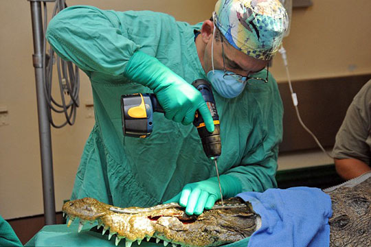 據(jù)英國媒體3月18日報(bào)道,美國佛羅里達(dá)動(dòng)物園一只受傷的大鱷魚,經(jīng)過手術(shù),頭部被41枚釘子以及4塊鐵板固定,現(xiàn)在被人戲稱為“機(jī)器鱷魚”。這只長達(dá)10英尺的鱷魚是在一起車禍?zhǔn)鹿手惺軅。?jīng)醫(yī)生介紹,現(xiàn)在鱷魚的恢復(fù)情況良好。