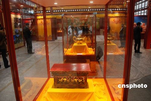 為期五天的“雪域風情——藏族非物質文化遺產精粹展”三月二十日下午在澳門綜藝館開幕,展出了十世班禪獻給中央人民政府的木桌(圖中)等珍貴文物。圖為開幕前工作人員在作最后準備。中新社發(fā) 畢永光 攝