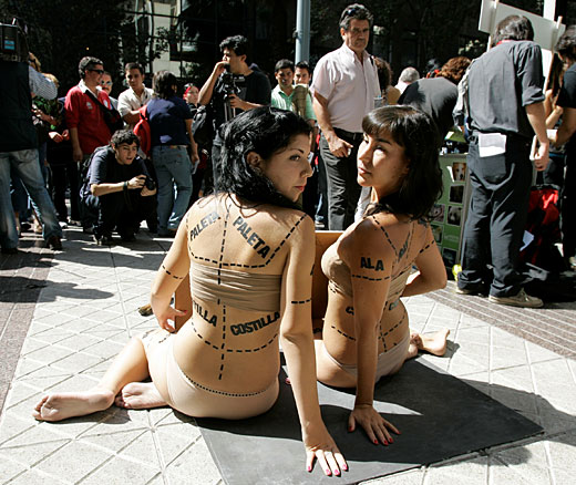 當(dāng)?shù)貢r(shí)間3月19日,來自AnimaNaturalis動物保護(hù)組織的智利美女在首都圣地亞哥舉辦了一場別出心裁的“裸身切割”活動,呼吁民眾保護(hù)動物。