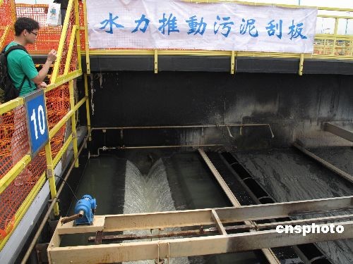 香港特區(qū)政府渠務(wù)署在迎來成立二十周年之際,于二零零九年三月二十一日向市民開放昂船洲污水處理廠,展示污水凈化處理過程,介紹和體驗港府正斥巨資推行的凈化海港計劃。圖為市民觀看污水進入沉淀池后,水力推動的污泥刮板在水面上層刮起一層層黑臭污垢的過程。 中新社發(fā) 余瑞冬 攝