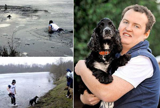 狗主人破冰救寵。據(jù)英國(guó)媒體報(bào)道,有時(shí)人類最好的朋友也需要朋友。因此,當(dāng)馬克(Marc Greenhalgh)的可卡犬賈維斯(Jarvis)被困在結(jié)冰的湖中時(shí),他義無(wú)反顧的跳進(jìn)去拯救它。