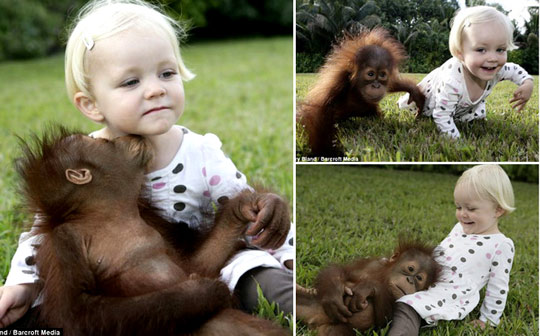 兩歲女孩的猩猩朋友。才一歲大的小猩猩Rishi被美國邁阿密一家動物研究所收養(yǎng)后,和攝影師巴里的女兒艾米麗(Emily)很快便成為了好朋友,他們甚至一起玩過家家。