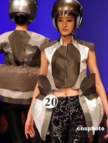 3月24日,在北京開幕的中國國際時裝周(09/10秋冬系列)展示系列活動上,舉行了第17屆中國國際青年設(shè)計師時裝作品大賽決賽,來自18個國家的31位青年設(shè)計師和來自中國15個省市地區(qū)的24位設(shè)計師參加作品展示。圖為模特展示頗具太空感的時裝作品。中新社發(fā) 錢興強 攝