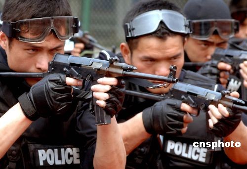 三月二十六日,三名持槍特警在福建警察學(xué)院戰(zhàn)術(shù)系教官指導(dǎo)下進(jìn)行模擬演練,處置突發(fā)事件。自三月二十三日開始,來自福州、廈門、漳州、泉州等福建各地的三十八名特警,在福建警察學(xué)院進(jìn)行為期一個(gè)月的封閉式訓(xùn)練,旨在提高特警處置突發(fā)事件能力。中新社發(fā) 劉可耕 攝