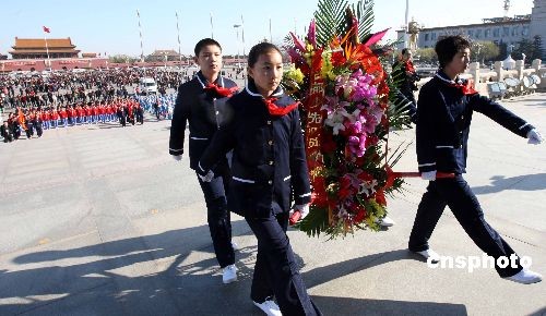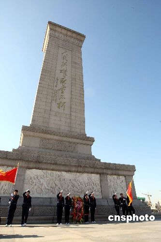 清明節(jié)臨近,來(lái)自北京市二十七中學(xué)的六名少先隊(duì)員代表4月1日向人民英雄紀(jì)念碑敬獻(xiàn)花籃,并為英烈站崗。人民英雄紀(jì)念碑前從一九八六年開(kāi)始設(shè)立少年先鋒崗,旨在對(duì)少年兒童進(jìn)行愛(ài)國(guó)主義教育。今年時(shí)值建國(guó)六十周年,此項(xiàng)活動(dòng)將從四月一日開(kāi)始直至十月三十一日結(jié)束,將有五千名少先隊(duì)員輪流參加站崗。中新社發(fā) 任海霞 攝