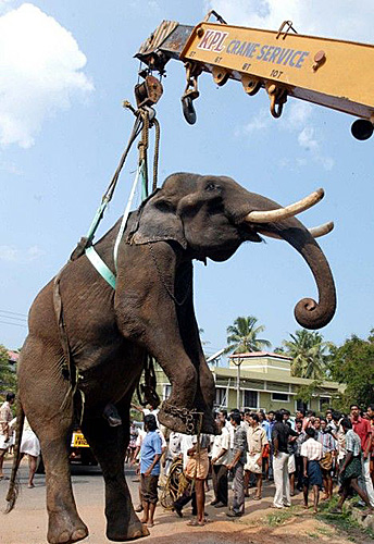 4月1日,印度喀拉拉邦一頭公象在交通繁忙的公路上被一輛卡車撞到,兩條后腿骨折和背部受傷,獸醫(yī)不得不動(dòng)用起重機(jī)來搬運(yùn)這個(gè)“龐然大物”。據(jù)報(bào)道,這頭大象高9英尺(約2.7米),重達(dá)6噸,剛剛從附近的一家印度教寺廟逃出。在事發(fā)現(xiàn)場(chǎng),數(shù)百名觀眾正在觀看獸醫(yī)如何救治受傷的大象和如何將它搬離現(xiàn)場(chǎng)。一名獸醫(yī)表示,這頭大象體型龐大,情緒極不穩(wěn)定。不過,它此前一直生活在附近人來人往的寺廟,所以對(duì)人并不十分恐懼。在對(duì)大象做過全面評(píng)估后,他們決定從附近的建筑工地上征用一輛起重機(jī),將這頭大象吊到卡車上,將它運(yùn)往一家獸醫(yī)醫(yī)院。據(jù)悉,搬運(yùn)工作進(jìn)展得十分順利。不過,令人可悲的是,盡管獸醫(yī)在努力救治這頭大象,但由于它的傷勢(shì)過于嚴(yán)重,于當(dāng)天晚間死去。