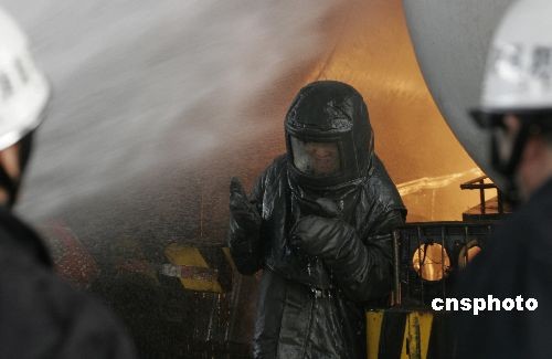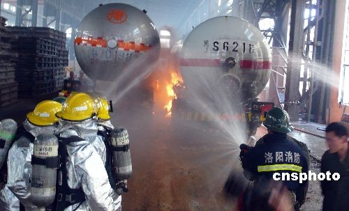 2009年4月13日上午9時(shí)許,兩輛液化氣槽車在位于洛陽市城區(qū)北部的紅山工業(yè)園區(qū)洛北鑄鋼廠內(nèi)作業(yè)時(shí)引發(fā)氣體泄漏燃燒事故,噴出的液化汽火焰在槽車罐體側(cè)部和底部不斷燃燒,罐體溫度不斷升高隨時(shí)都有爆炸危險(xiǎn),周圍數(shù)平方公里的生命和財(cái)產(chǎn)面臨嚴(yán)重威脅。洛陽消防支隊(duì)的10輛消防車輛和80名消防官兵,在多方噴水降溫的同時(shí),冒死沖入火海中控制泄露部位并將兩車有效分離,經(jīng)過2個(gè)多小時(shí)的撲救,阻止了一起嚴(yán)重爆炸事件的發(fā)生,事故未造成人員傷亡。目前事故原因正在調(diào)查之中。 中新社發(fā) 張曉理 攝
