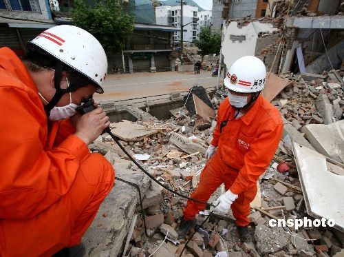 資料圖片:2008年5月15日,福州消防支隊赴川抗震救災(zāi)官兵在青川縣賓和路一家主建筑已全部坍塌的大型汽車維修廠,用生命探測儀成功解救出一名被困女工。當(dāng)時,在接群眾求助后,救援隊立即趕赴現(xiàn)場,搜索分隊首先用生命探測儀確定了女工被困的大概方位,救援分隊迅速啟動救生氣墊,并用鐵鍬和雙手以土工的方式為被困女工打開了一條生命通道,半個小時后,被困女工被成功救出。中新社發(fā) 朱曉航 攝
