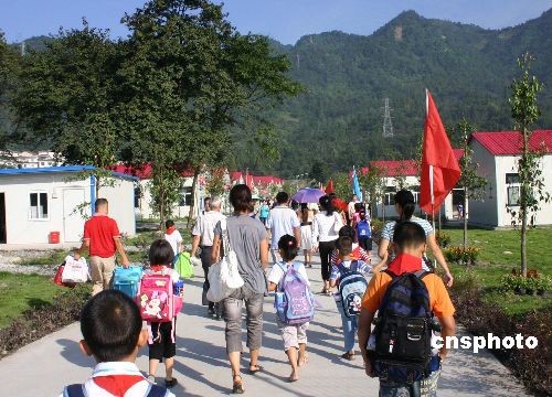 資料圖片:2008年9月1日,四川省兩萬(wàn)多所中小學(xué)新學(xué)期開(kāi)學(xué),五十一個(gè)地震重災(zāi)縣的五千九百七十九所中小學(xué)校百分之百?gòu)?fù)課。開(kāi)學(xué)第一天,在青翠的青城山下,都江堰最大的板房學(xué)校皖川中心校的孩子們走在美麗的校園中,低年級(jí)的孩子由家長(zhǎng)陪同來(lái)上學(xué)。中新社發(fā) 黃永莉 攝
