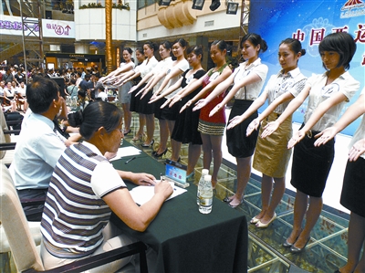 “請(qǐng)把劉海撥開”、“把小腿露出來(lái)”、“上前一步伸出雙手”、“請(qǐng)繞場(chǎng)一圈”……12日,“2009年中國(guó)亞運(yùn)空姐招募大匯”武漢賽區(qū),面試全部結(jié)束,5位專業(yè)評(píng)委嚴(yán)格按照標(biāo)準(zhǔn)篩選,1022名佳麗僅有542人拿到通行證,晉級(jí)下一輪。
