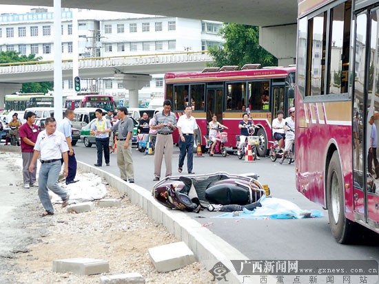 7月12日下午,一輛摩托車(chē)和一輛公交車(chē)同向行駛,途經(jīng)南寧市雙擁桃源路口時(shí)發(fā)生碰撞,摩托車(chē)手被撞身亡,事故造成附近路段塞車(chē)嚴(yán)重。