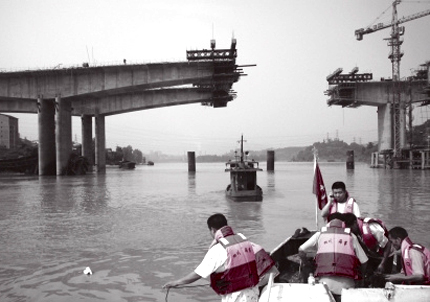 經(jīng)過10分鐘的航行,兩艘打前站的探摸船只從上游進入出事水域。只見寬近300米的河面上,正中矗立著四根數(shù)十米高的橋墩,上面的橋面才剛剛建設。