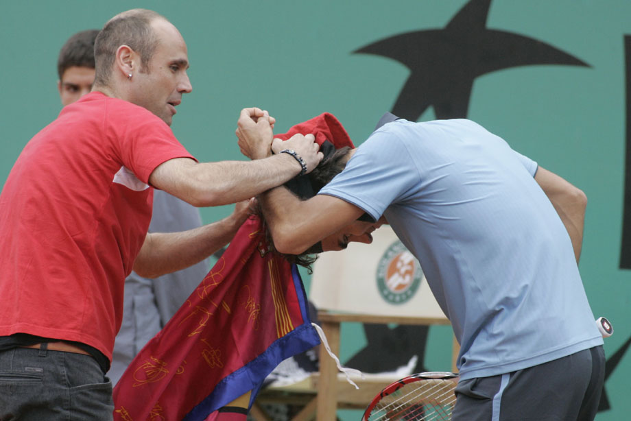 法網(wǎng)男單決賽場上,一位費天王的癡心球迷沖入球場,強行將自制的一頂帽子戴到費德勒的頭上。安保人員及時出現(xiàn),將狂熱粉絲架出場外。