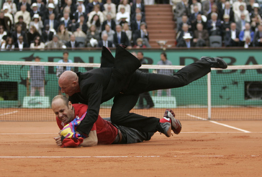 法網(wǎng)男單決賽場上,一位費天王的癡心球迷沖入球場,強行將自制的一頂帽子戴到費德勒的頭上。安保人員及時出現(xiàn),將狂熱粉絲架出場外。