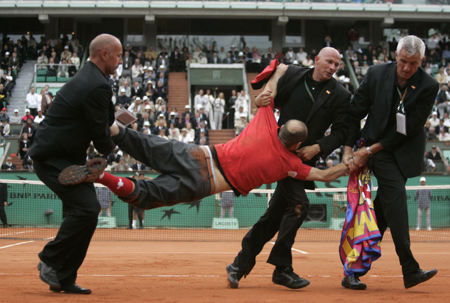法網(wǎng)男單決賽場(chǎng)上,一位費(fèi)天王的癡心球迷沖入球場(chǎng),強(qiáng)行將自制的一頂帽子戴到費(fèi)德勒的頭上。安保人員及時(shí)出現(xiàn),將狂熱粉絲架出場(chǎng)外。