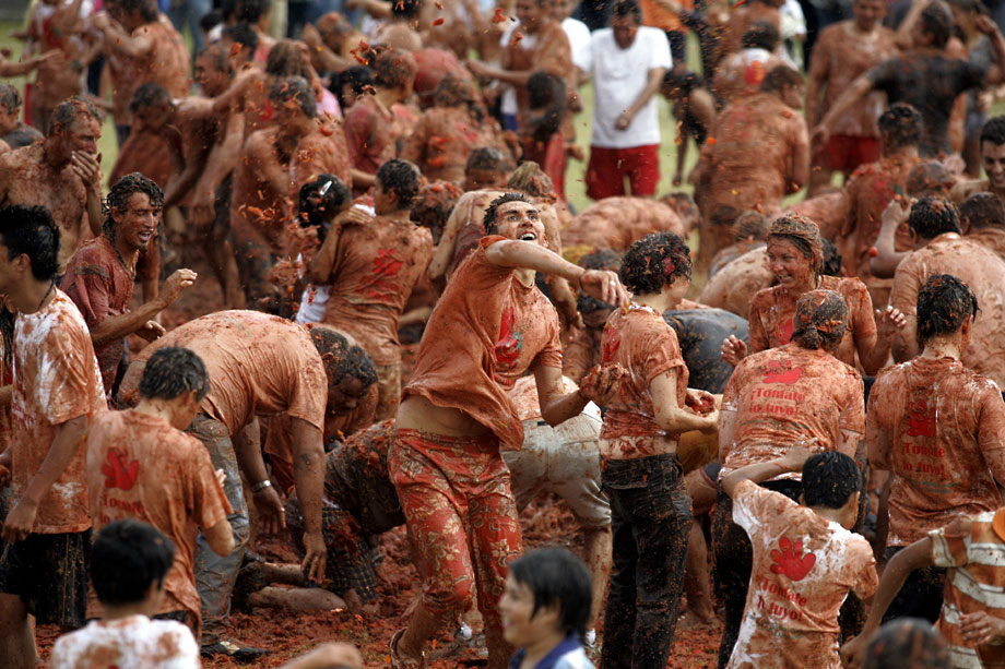 2009年6月14日,哥倫比亞第五屆番茄狂歡節(jié)開(kāi)幕,參與者互相投擲西紅柿,盡情狂歡慶豐收。來(lái)自哥倫比亞各地的狂歡者們?cè)萍谑锥疾ǜ绱髺|北部的蘇塔馬錢(qián)小鎮(zhèn),街道上立刻變成了西紅柿紛飛的戰(zhàn)場(chǎng)。雖然每個(gè)人的臉上身上沾滿了西紅柿汁,但人們還是樂(lè)此不疲又是丟又是砸,把成堆的西紅柿當(dāng)成打仗的“武器”。還有人特地穿上白衣白褲,身上越紅,心里就越痛快。