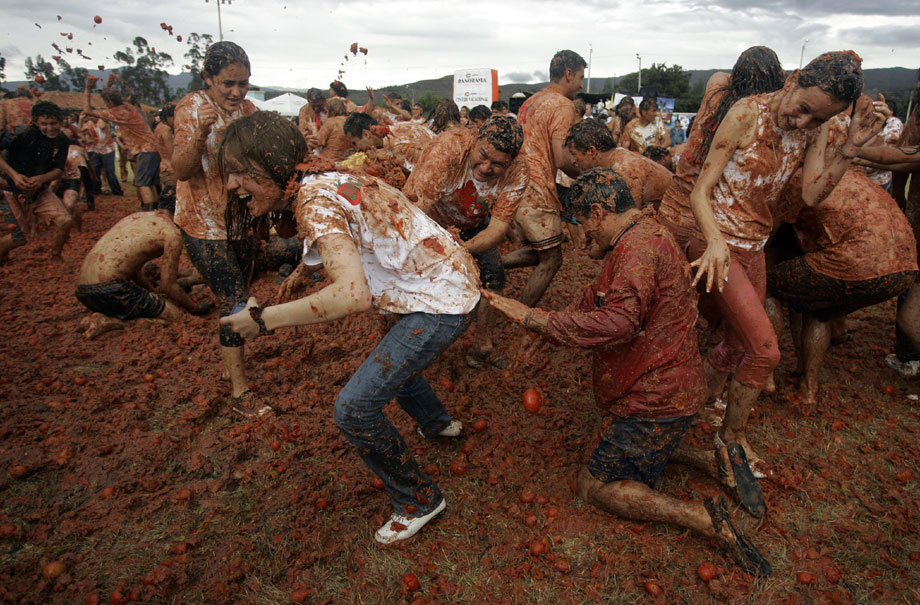 2009年6月14日,哥倫比亞第五屆番茄狂歡節(jié)開(kāi)幕,參與者互相投擲西紅柿,盡情狂歡慶豐收。來(lái)自哥倫比亞各地的狂歡者們?cè)萍谑锥疾ǜ绱髺|北部的蘇塔馬錢(qián)小鎮(zhèn),街道上立刻變成了西紅柿紛飛的戰(zhàn)場(chǎng)。雖然每個(gè)人的臉上身上沾滿了西紅柿汁,但人們還是樂(lè)此不疲又是丟又是砸,把成堆的西紅柿當(dāng)成打仗的“武器”。還有人特地穿上白衣白褲,身上越紅,心里就越痛快。