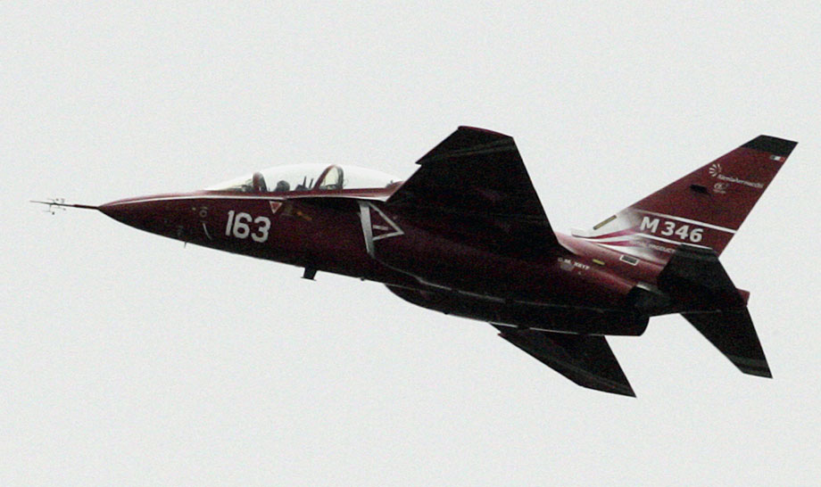 圖為意大利M-346戰(zhàn)斗機(jī)進(jìn)行飛行表演。