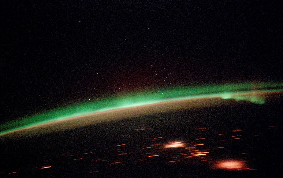 在兩極上空大氣層以上數(shù)十公里的太空,極光現(xiàn)象仍能被清楚地觀測到。紅色、綠色的極光閃爍著怪異的微弱綠光,好似鬼怪之光,給人以寒冷的感覺。在繞地軌道上的宇航員用長曝光相機和35毫米膠片拍攝下了這些怪異的圖片。