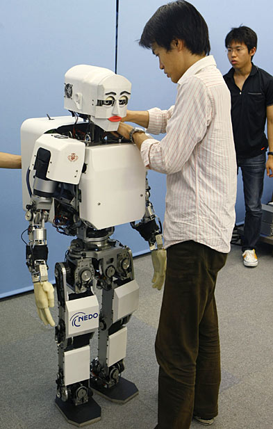 圖為工作人員在維護(hù)機(jī)器人KOBIAN。