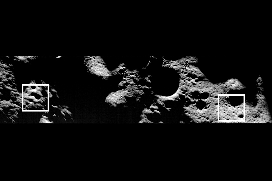 此圖顯示的是月球表面兩個位置的相互關(guān)系,圖片顯示的地區(qū)寬3542米,長14000米。