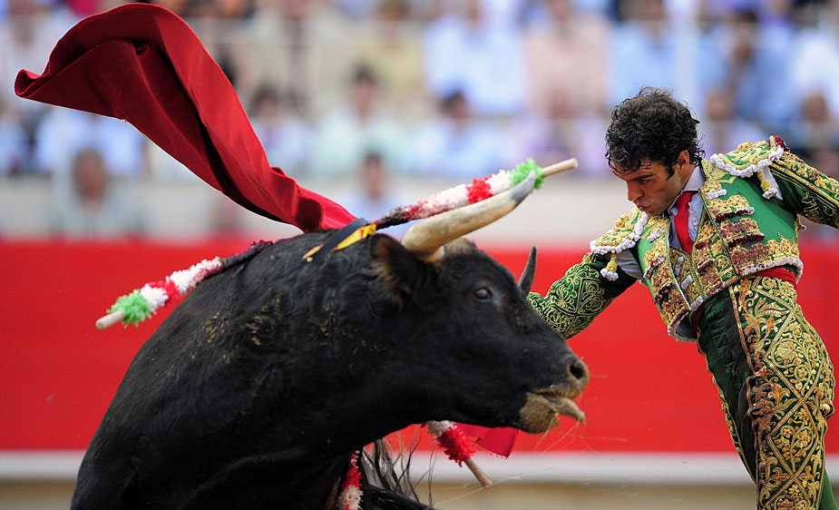 7月5日,西班牙巴塞羅那舉行了一場驚險(xiǎn)的斗牛比賽,一位斗牛士在與牛較量時(shí)被牛頂起,所幸該人“武功”高強(qiáng)未造成大的傷害。