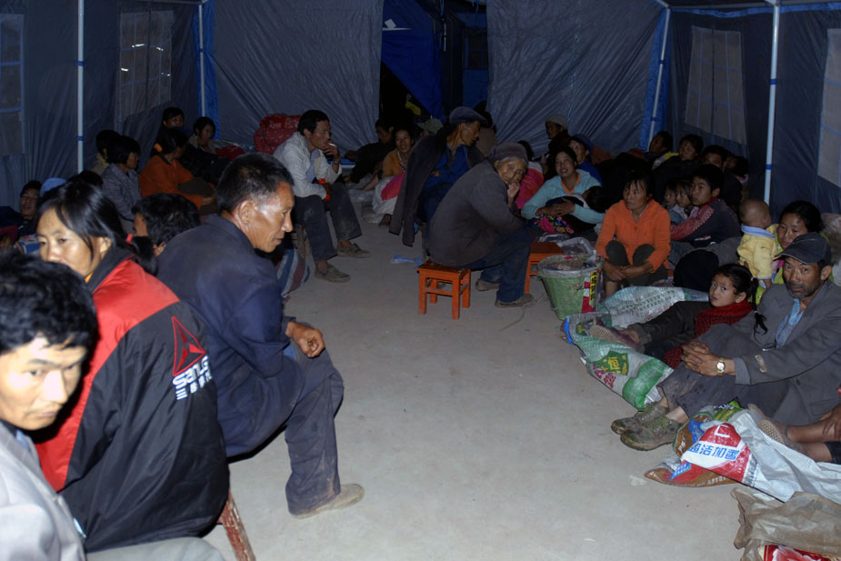 圖為受災(zāi)最為嚴(yán)重的官屯鄉(xiāng)官屯村災(zāi)民,在當(dāng)?shù)毓偻托W(xué)搭建的臨時(shí)安置點(diǎn)渡過震后的第一夜。中新社發(fā) 保旭 攝