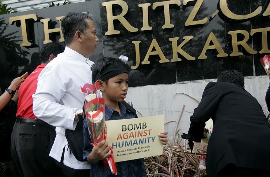 7月18日,印度尼西亞首都雅加達(dá)的民眾紛紛來到發(fā)生爆炸的萬豪酒店和麗嘉酒店,向死難者獻(xiàn)花表示哀悼。