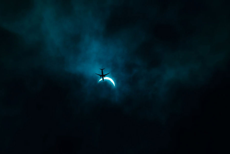 2009年7月22日上午9點20分左右,武漢出現(xiàn)日全食,恰逢客機穿越。dannier zheng/CFP