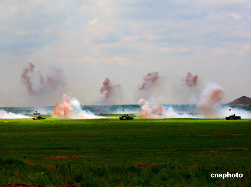 中國、俄羅斯兩軍總參謀長,7月23日上午到沈陽軍區(qū)洮南合同戰(zhàn)術(shù)訓練基地,觀看“和平使命2009”聯(lián)合反恐軍事演習。雙方以陸軍和空軍為主,中方參演部隊包括1個陸軍戰(zhàn)斗群和1個空軍戰(zhàn)斗群。俄方參演兵力包括1個陸軍加強摩步營、1個空降突擊連和部分空軍兵力,雙方投入兵力兩千多人。中新社發(fā) 宋吉河 攝