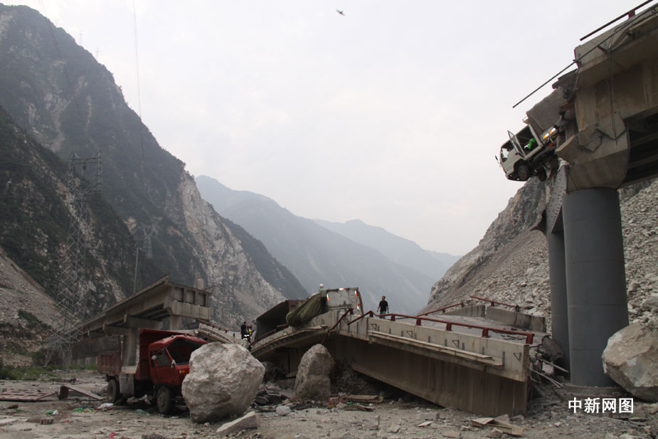 25日凌晨四點鐘左右,汶川縣境內(nèi)國道二一三線徹底關(guān)大橋被山上飛下來的巨石砸斷,已造成100米的橋面坍塌,7輛汽車受損,12人不同程度受傷,3人死亡,都汶路通行中斷。汶新 攝