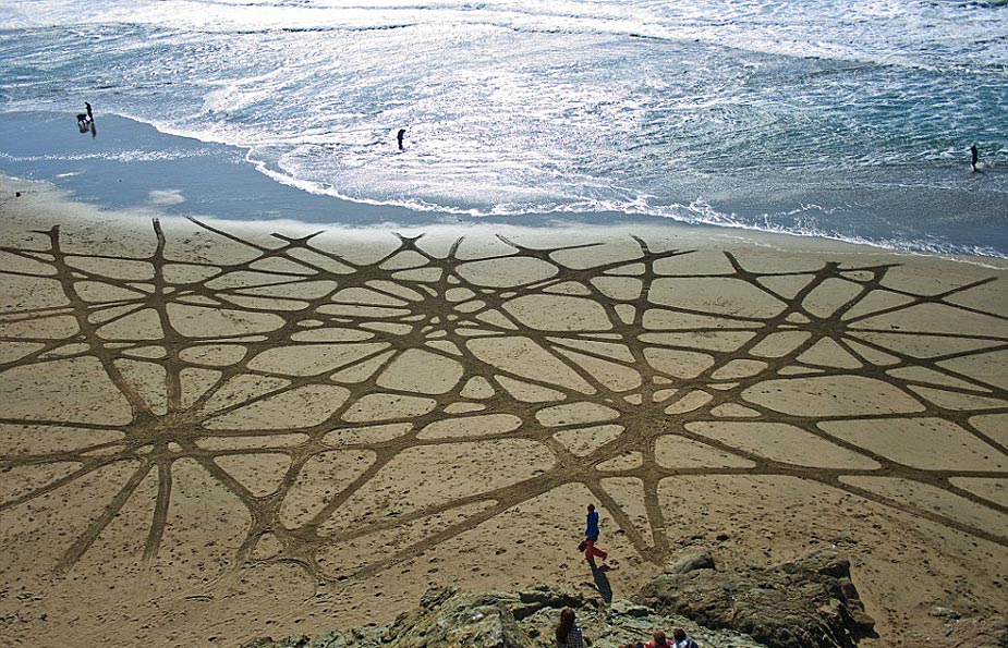 據(jù)英國(guó)媒體7月27日?qǐng)?bào)道,藝術(shù)家Andres Amador用耙子在沙灘上作畫,眾多中心對(duì)稱的幾何圖形,不在乎是否能長(zhǎng)久保留,但求被海浪帶走前與大自然的完美融合。
