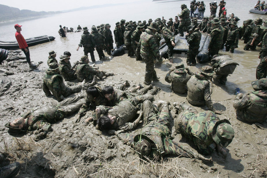 當(dāng)?shù)貢r間7月30日,在首爾的美軍基地參加軍訓(xùn)夏令營的韓國數(shù)百名學(xué)生來到金浦進行了泥地訓(xùn)練,場面十分激烈甚至殘酷。