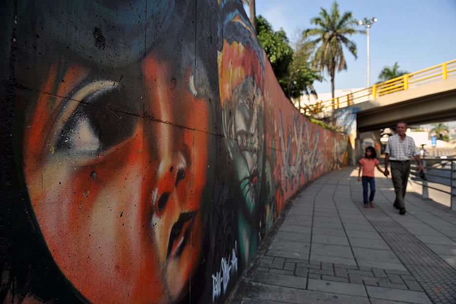 近日,哥倫比亞考卡山谷省卡利市的年輕人用涂料在墻上涂鴉,表達(dá)他們對世界的看法。